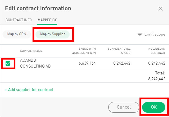 If the spend from Acando Sverige AB is supposed to be included on the contract, you must select the supplier and press OK.