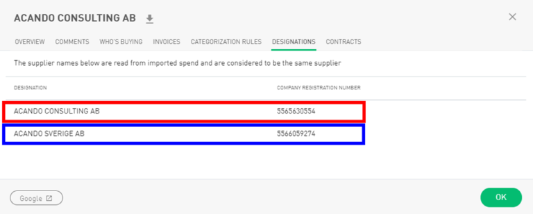 Looking at the supplier, we can see that Acando Consulting AB has been normalized with Acando Sverige AB. The spend highlighted in blue includes both the suppliers, while the red spend refers only to Acando Consulting AB.