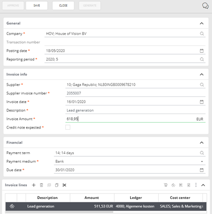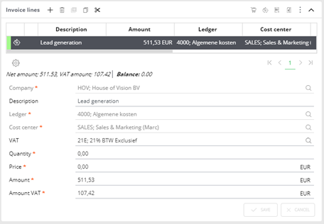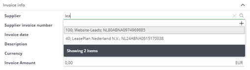 Specifically for the supplier field a “/” can be used to search based on supplier number. When no “/” is used the search will start in the name and bank account number. In other entry fields (like ledger, VAT code, payment term) we will search in the code and description for the text you entered.