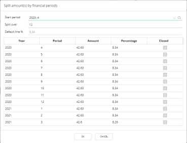 Dividing an amount over periods will now also consider the reporting periods that have been entered in the environment. If these are not sufficient to continue booking in the future, the remaining amount will be added as a new line after the last period. By the use of a setting it can be (un)blocked to book lines in closed periods. Whenever this is allowed and you are booking lines in a closed period the table will show this information. If it is not allowed the amounts for the closed periods will be summed up and booked in the first open period in the selection. If insufficient periods are available the last line will contain the remaining amount that could not be split properly.