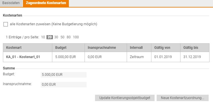 On the tab Assigned cost elements you can then see the assigned cost elements, as well as the budget stored and already used for the cost element.