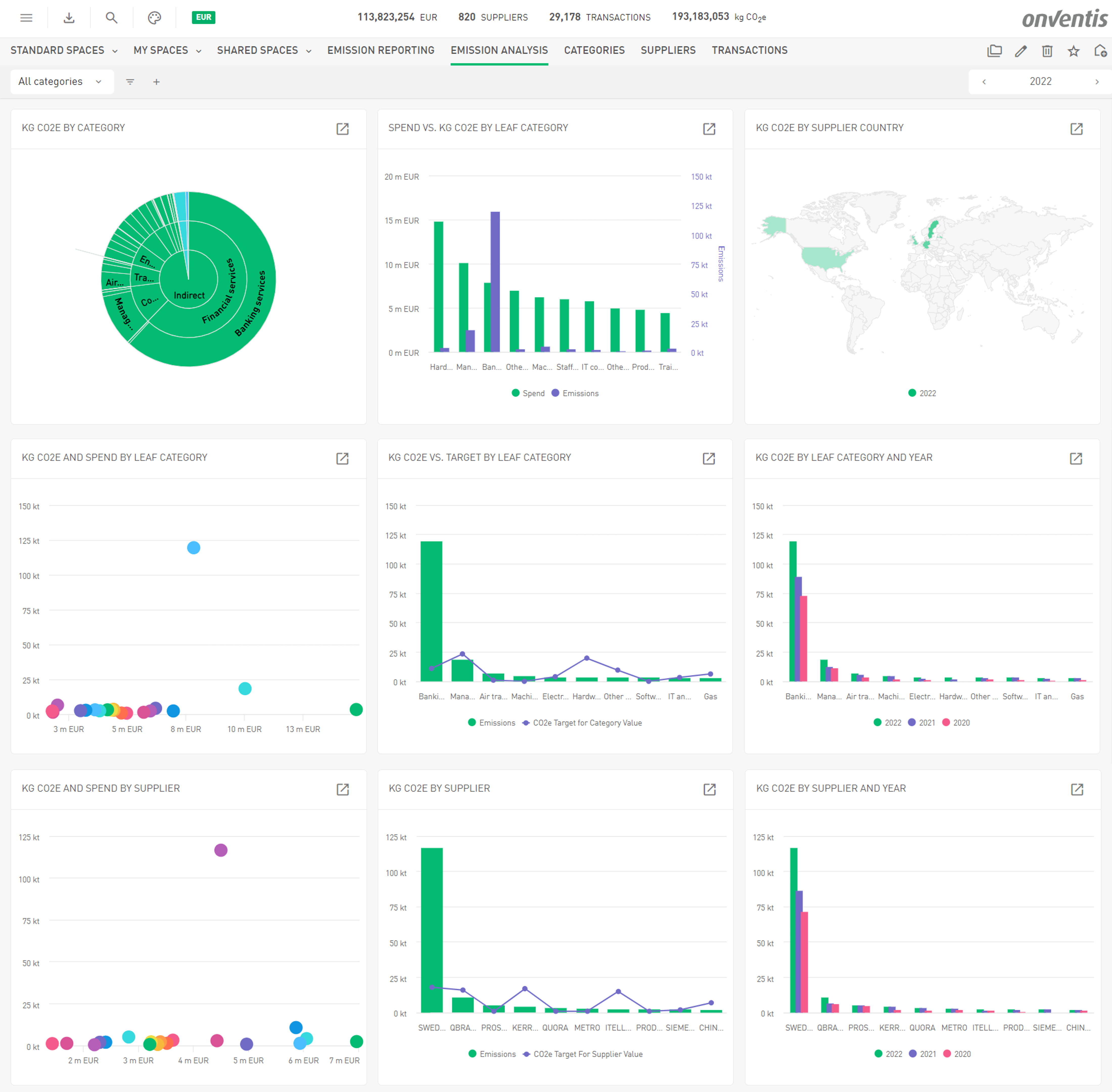 You can set emission targets for all entities, with default target attributes available for categories called “CO2 Target for Category” and suppliers called “CO2 Target for Supplier”. Targets can be analyzed as metrics, allowing you to compare actual emissions against your goals and track progress in reducing emissions.