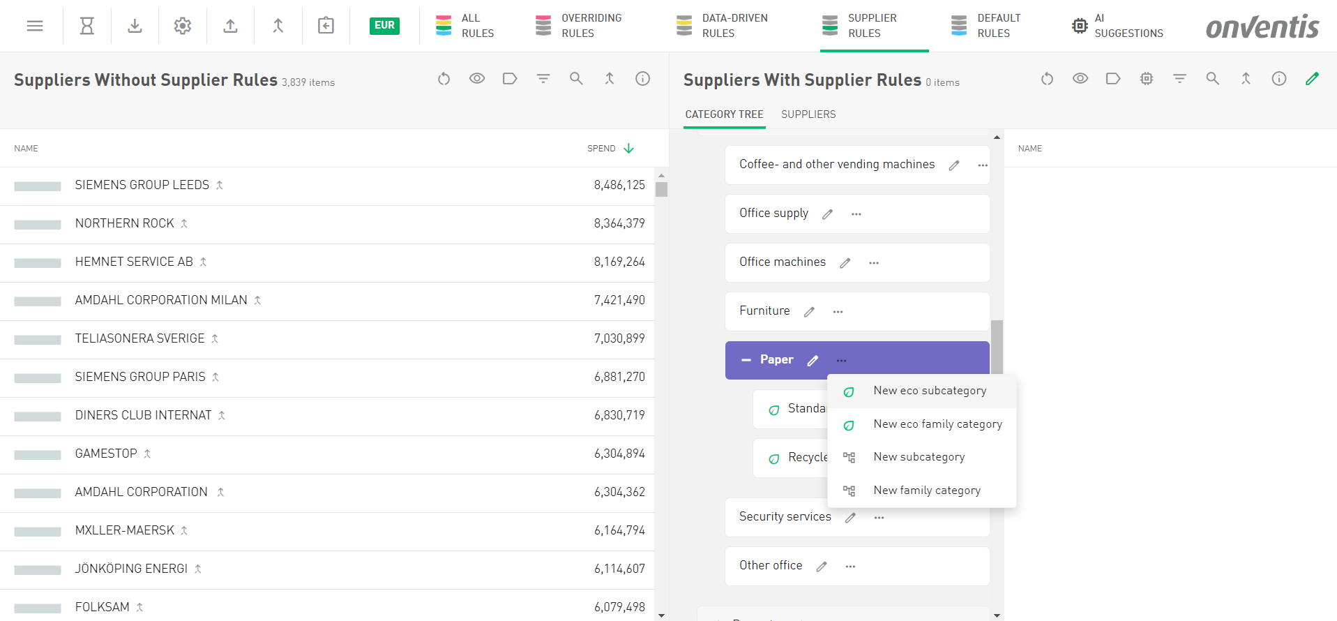 Complete your spend category tree to include all categories you want to analyze. You can also create dedicated eco-categories specifically for emission analysis. For example, breaking down 'Transportation' into “Electric Vehicles," "Hybrid Vehicles”, "Rail Transport," "Air Freight" etc., may not be crucial for spend analysis but can provide more precise—and often lower—emission factors, ultimately reducing your reported emissions.