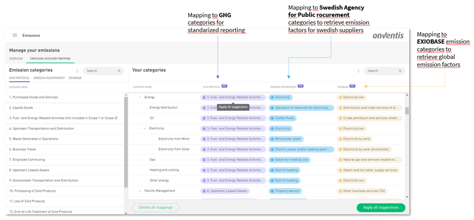 On the Emission Mapping page, you’ll find the emission categories from various sources displayed on the left.