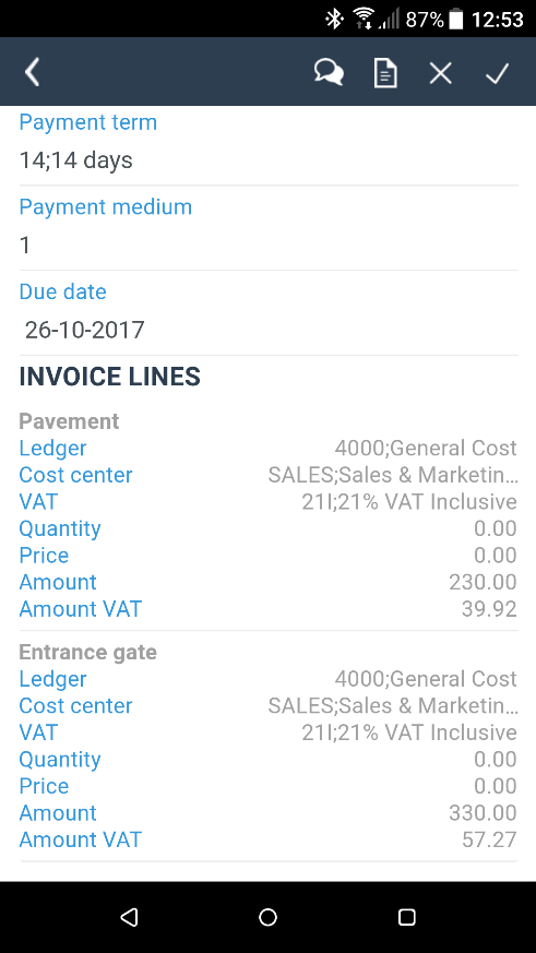 Depending on the type of transaction, lines may be shown at the bottom of the screen (for instance invoice lines or order lines). You can click on them to see the details.