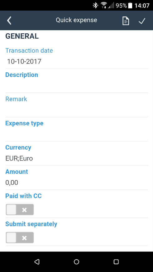 It is possible for several type of transactions to create a new one. In that case, a button will be shown in the main screen. When you click on this, the input screen will pop up. As an example, you see the screen for a new expense claim.