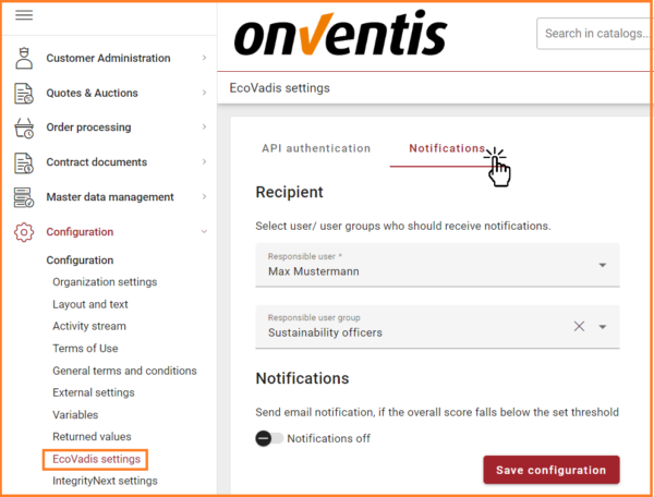 With the new release, our customers using âAPI Connector for EcoVadisâ will receive alert notifications if the âOverall scoreâ falls below a certain threshold. The settings to enable notifications can be accessed through the âNotificationsâ tab available in the âEcoVadis settingsâ under âConfigurationâ. Users can configure the âResponsible User/User groupâ who are responsible for sustainability assessment of suppliers to receive these notifications.