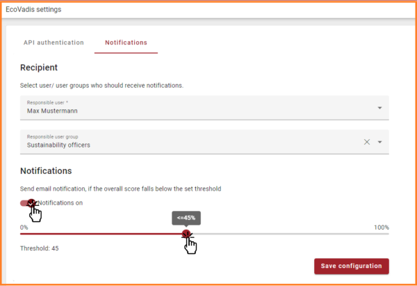 The users can also configure the risk threshold for the overall score via the slider within the range 0 to 100. If the overall score falls below the risk threshold, an email is sent to the âResponsible user/user groupâ configured in the system. A link to EcoVadisâs scorecardâ is provided in email to view detailed score.