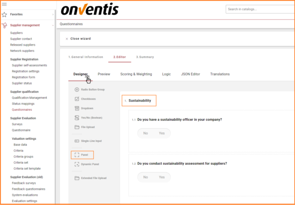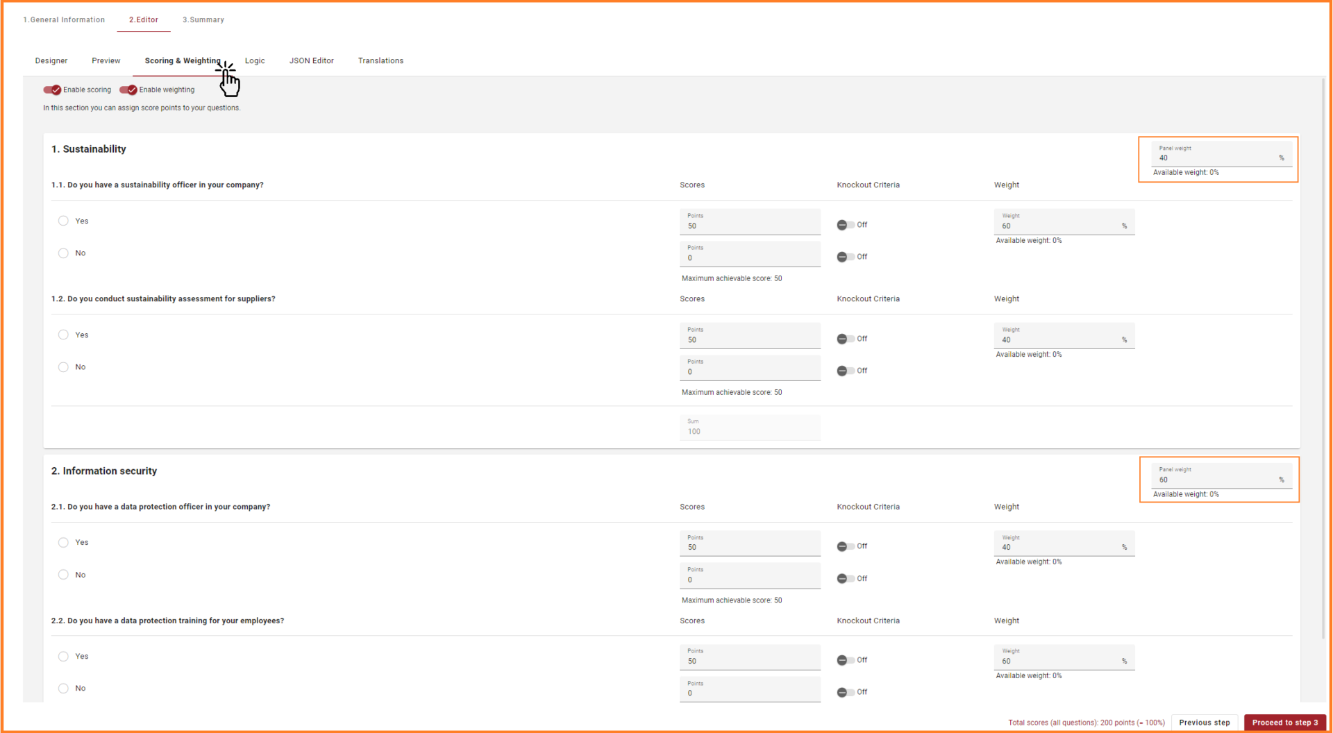 The âScoring and Weightingâ section under the âEditorâ tab allow users to add scoring and weighting to different questions. With this release, users can also add weighting to panels. With this functionality users can add weighting to individual panels such as sustainability and then add weighting to questions inside that panels. This functionality is extremely useful when designing a questionnaire that consists of several questions.