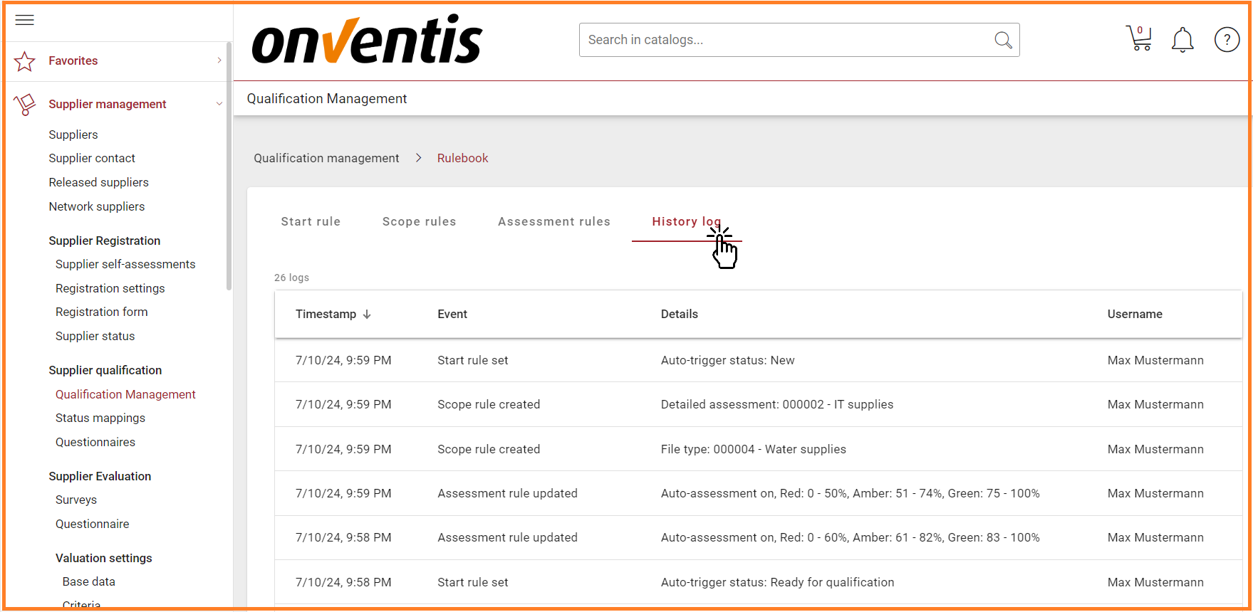 The âRulebookâ tab under âQualification managementâ acts as the rule engine for the supplier qualification module. The rulebook facilitates automation and reduces the manual effort for configuring qualification process for individual suppliers. Inside the rulebook, users can configure the âStart ruleâ, âScope rulesâ, and âAssessment rulesâ
