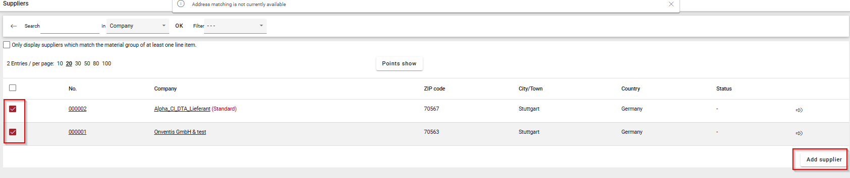 A new "Add Selected Suppliers" button allows adding multiple suppliers at once.