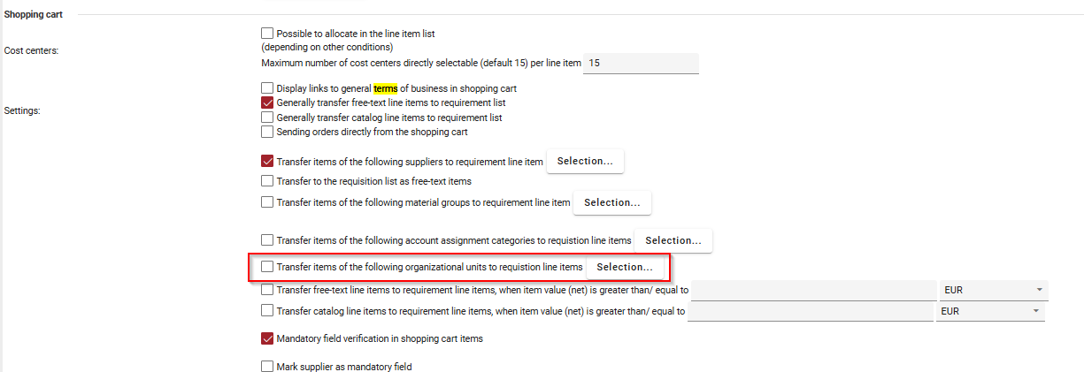 A new OrgUnit-based setting allows transferring shopping cart items to requisition line items based on the OrgUnit selected in the cart header.