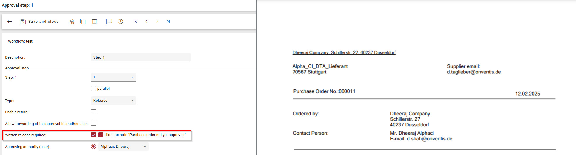 Introduced a new checkbox to control the visibility of the "Purchase order not yet approved" note in PDFs for written release approval steps.