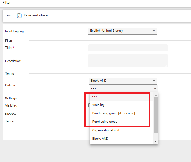 The existing "Purchasing Group" filter has been renamed to "Purchasing Group (Deprecated)" to introduce a new filter in Article Favorites.