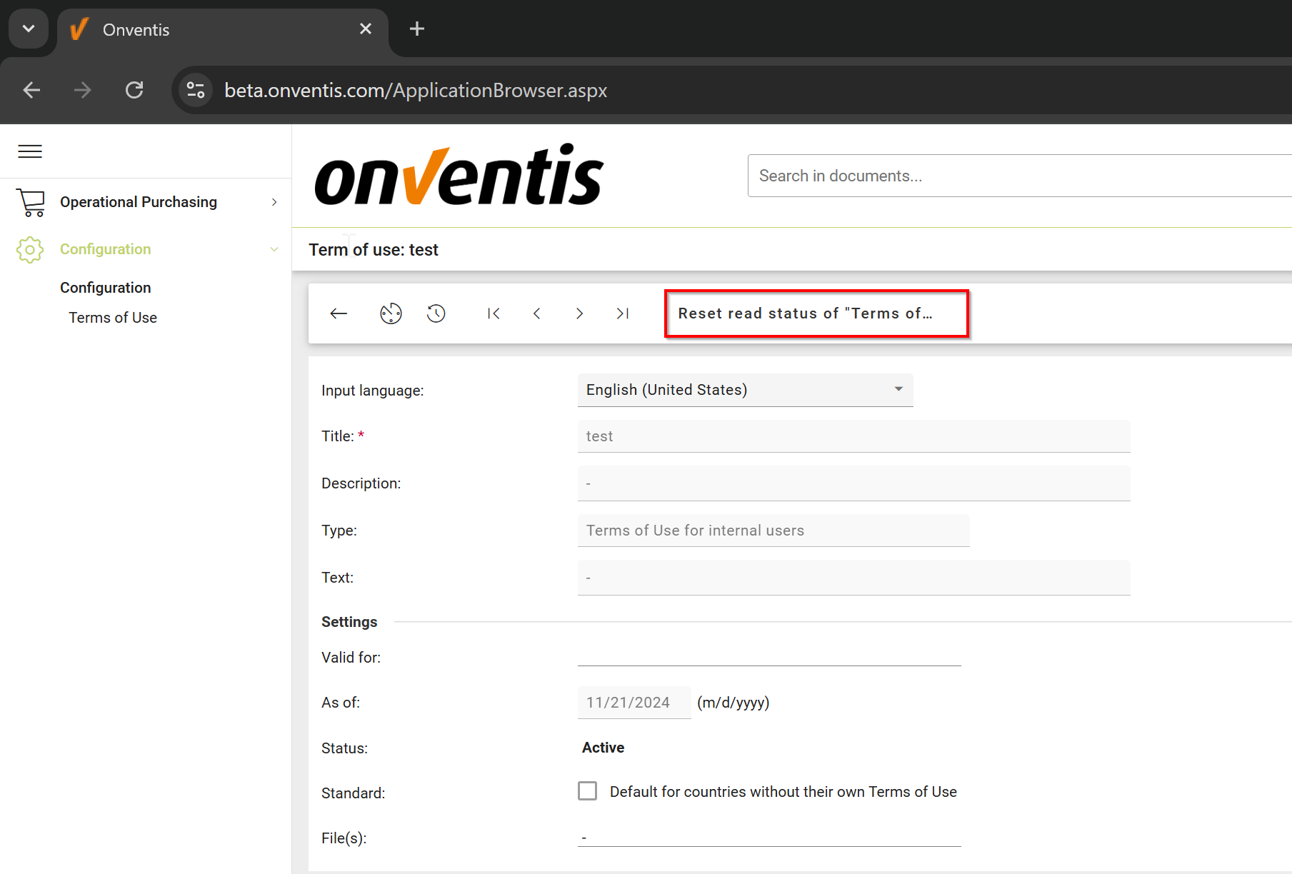 The "Reset Read Status of Terms of Use" button is now hidden for users with only view rights.