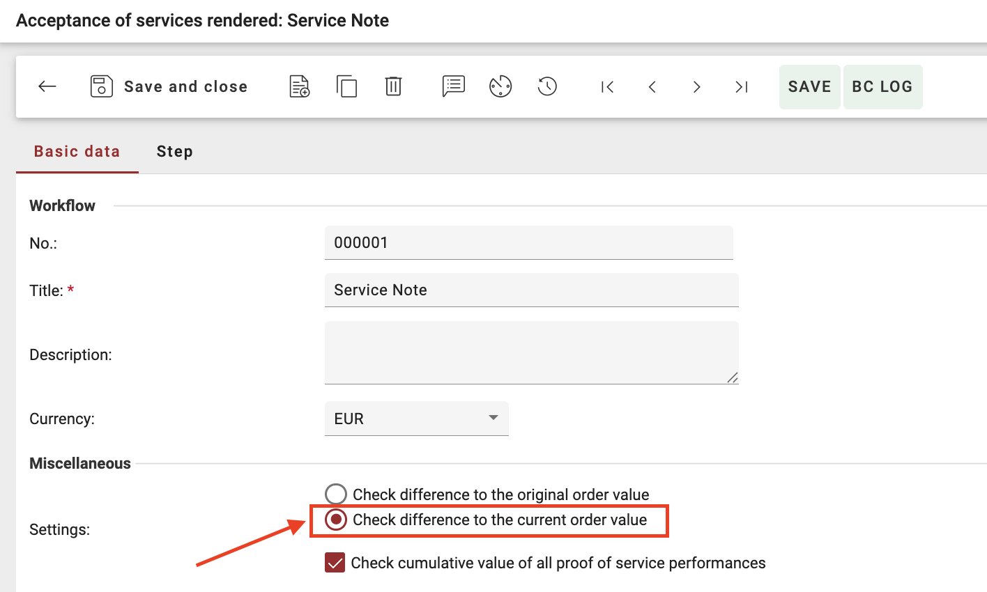 Workflow settings â Service Note Approval â Miscellaneous section â New option: "Check the difference to the current order value"