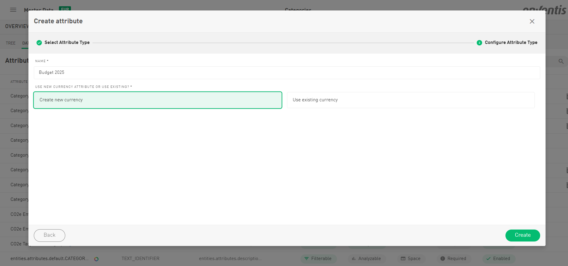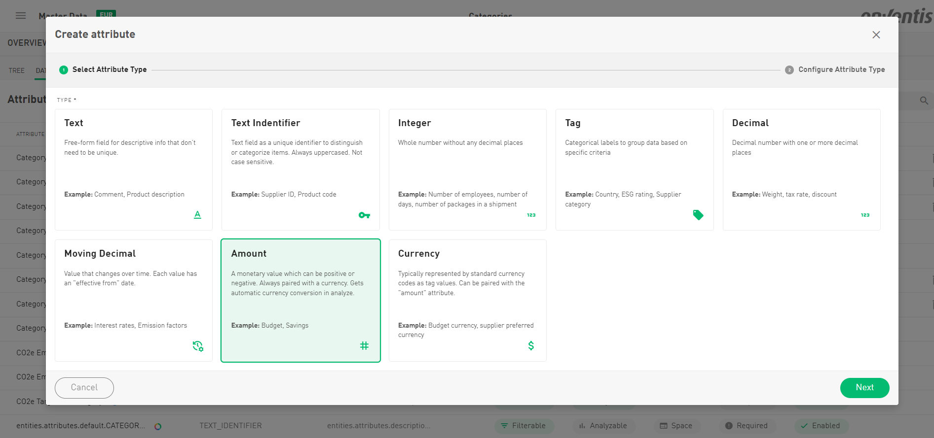 We now introduce a new attribute type called “Amounts”, that can be put on all entities. Our amount attribute type is extremely versatile and can be used to set up financial metrics like budgets, spending thresholds, or planned expenditures, especially across different organizational units like subsidiaries.