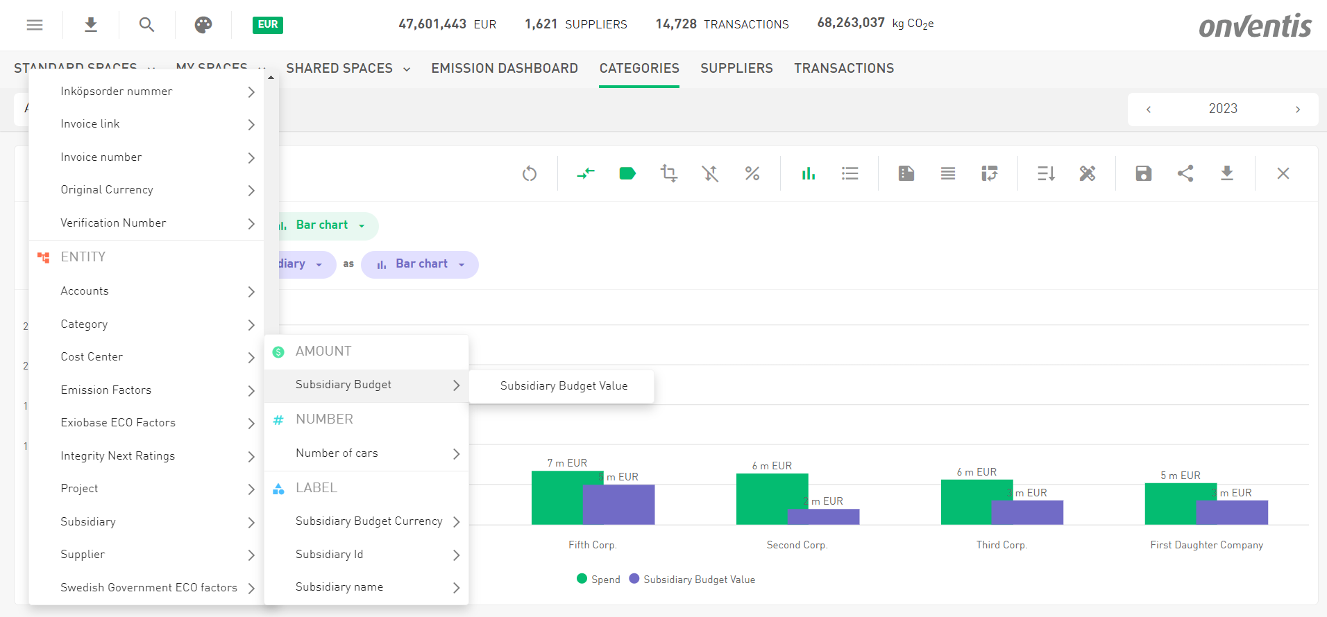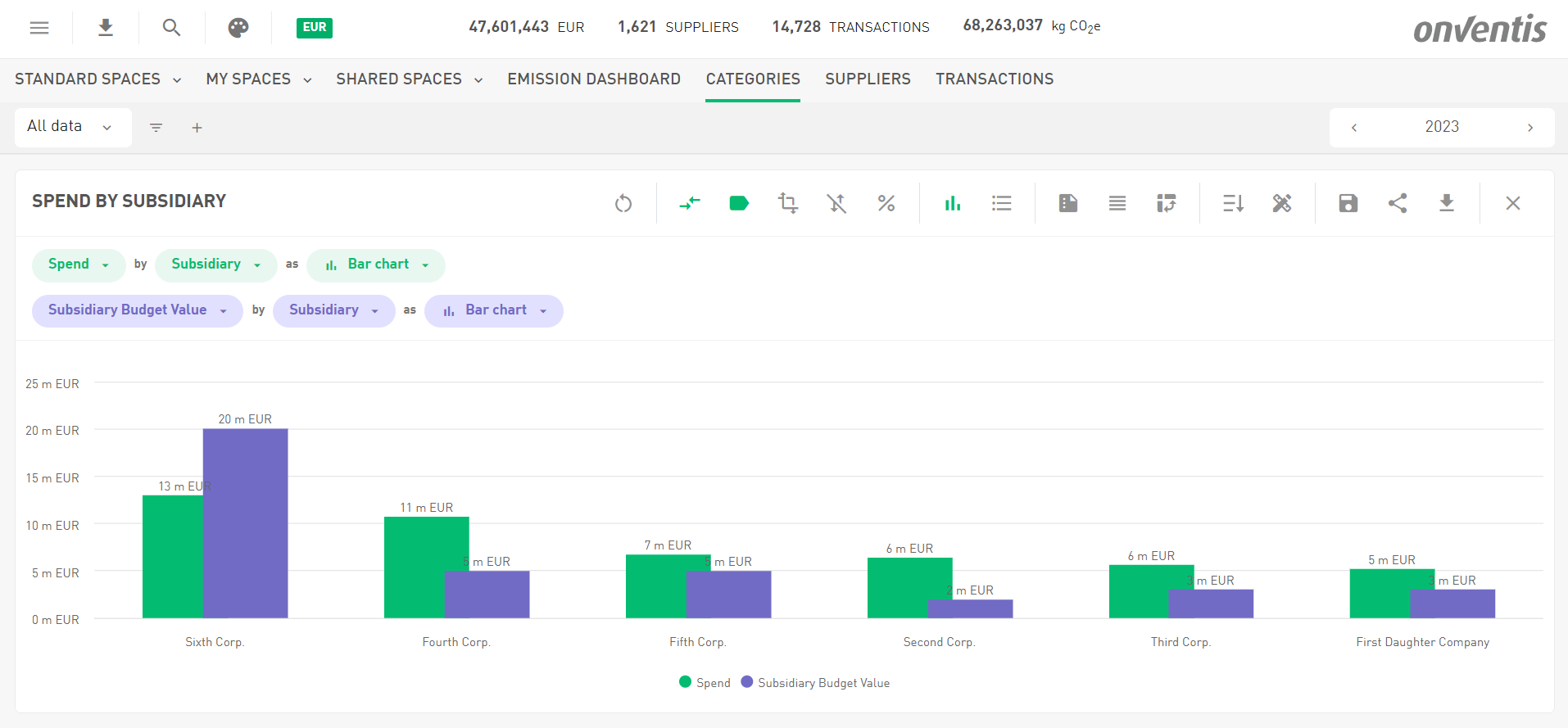 Amount values can be analyzed as metrics, allowing for meaningful comparisons. One of the key strengths of using an amount attribute in spend analytics is to compare planned budget amounts against actual spending. By aggregating the budgeted amounts for e.g. a subsidiary and comparing them with the actual expenditures, you can easily identify budget variances, overspending, or underspending. For example: